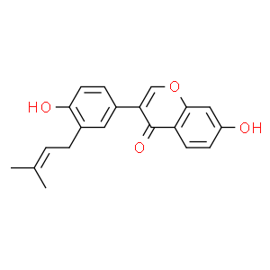| 中文別名: | 新補骨脂異黃酮;NEOBAVA異黃酮(AS);新補骨脂異黃酮 Neobavaisoflavone;新補骨脂異黃酮對照品;4';7-二羥基-3'-(3-甲基-2-丁烯基)異黃酮;7-羥基-3-(4-羥基-3-(3-甲基丁-2-烯-1-基)苯基)-4H-色烯-4-酮;7-羥基-3-[4-羥基-3-(3-甲基-2-丁烯-1-基)苯基]-4H-1-苯并吡喃-4-酮 | ||